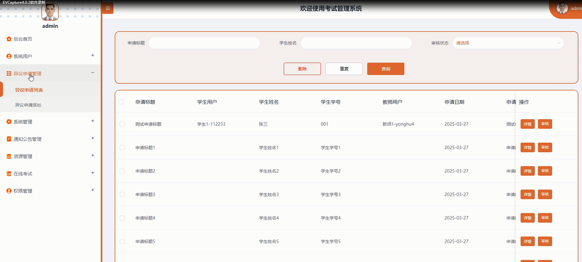异议申请:可查询本人提交的所有异议申请详情,支持重置搜索条件,如通过申请标题、学生姓名、审核状态等条件筛选已申请记录。
