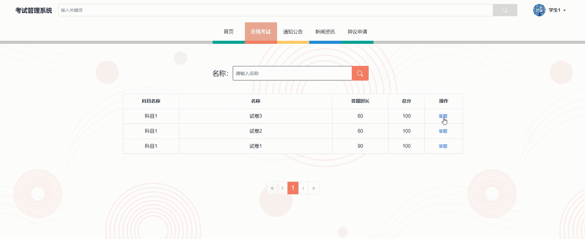 在线考试:学生可根据科目名称搜索相应的考试任务,在线答题并提交试卷;考试结束后可查看考试成绩,成绩信息包括得分、排名及各题作答情况。