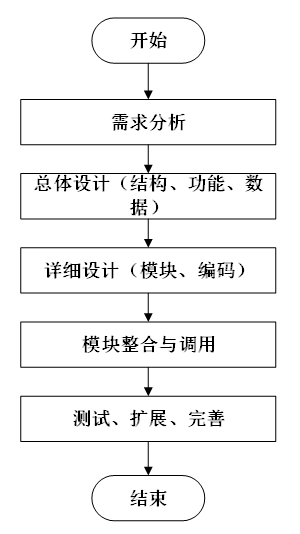 系统开发流程的主要步骤,从需求分析到系统完成的全过程。流程包括需求分析、总体设计(结构、功能、数据)、详细设计(模块、编码)、模块整合与调用,以及测试、扩展和完善,最终完成系统的开发。本系统的开发流程如图3-4所示