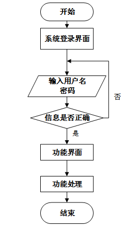 用户首先进入系统登录界面,输入用户名和密码后,系统验证信息是否正确。若验证失败,返回登录界面重新输入;若验证成功,则进入功能界面,执行相应功能处理后结束操作流程。操作流程如图3-6所示。