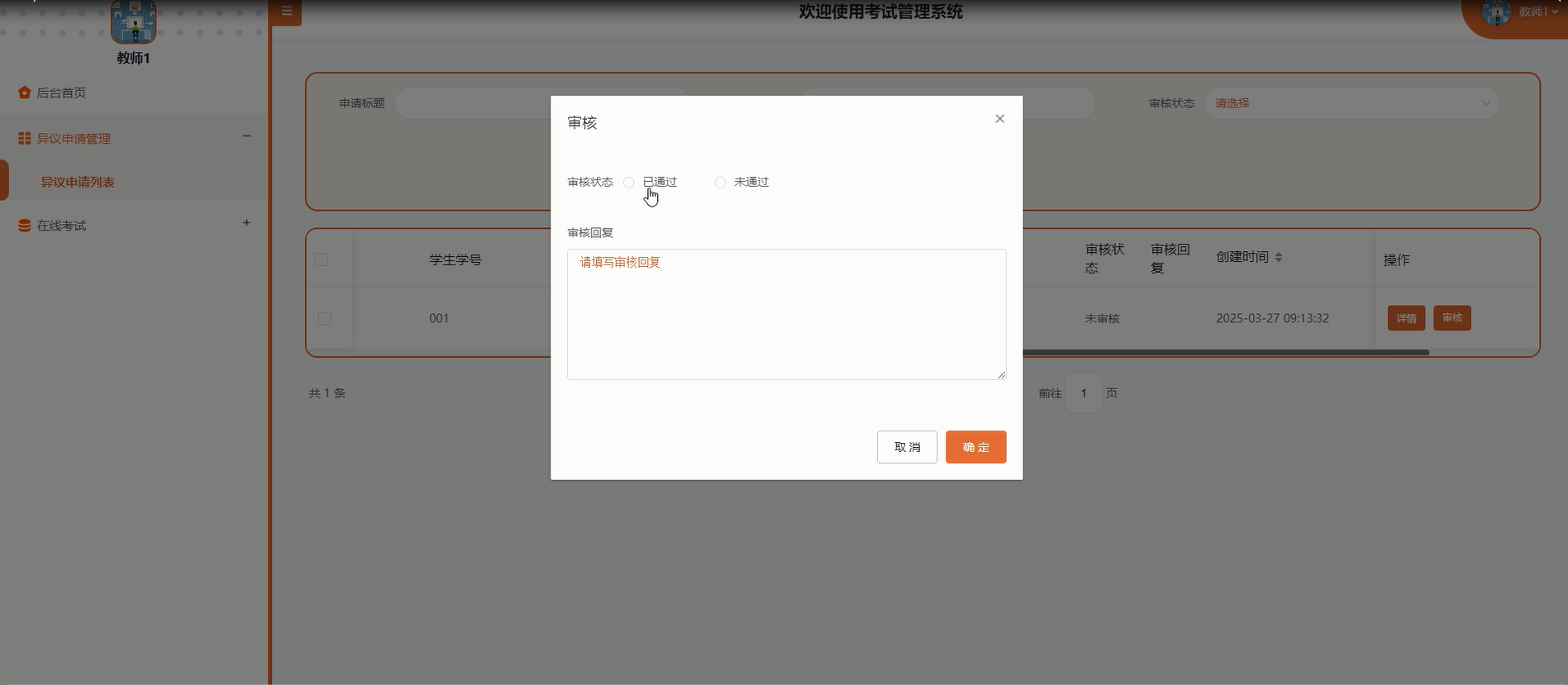 异议申请管理:教师可以查询、重置与自己相关的异议申请列表详情,包括学生提交的异议申请标题、姓名、学号、申请日期及具体内容等信息。对于每一条异议申请,教师需要根据实际情况进行审核,并填写审核意见和结果。