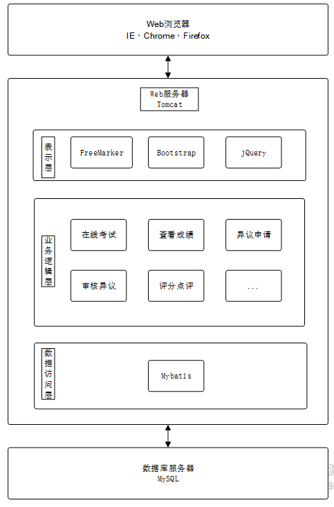 系统由表现层、业务逻辑层、数据访问层和数据库服务器组成。表现层通过浏览器(如IE、Chrome、Firefox)与用户交互,采用FreeMarker、Bootstrap、jQuery等技术实现界面呈现。业务逻辑层负责处理系统的核心业务逻辑,通过分模块设计实现功能分离。数据访问层使用MyBatis框架连接数据库,执行数据的增删改查操作。数据库服务器采用MySQL进行数据存储和管理,为系统提供稳定的数据库支持。整个架构通过Tomcat服务器完成用户请求的接收和处理,确保系统的高效运行。整个系统架构如图4-1所示。