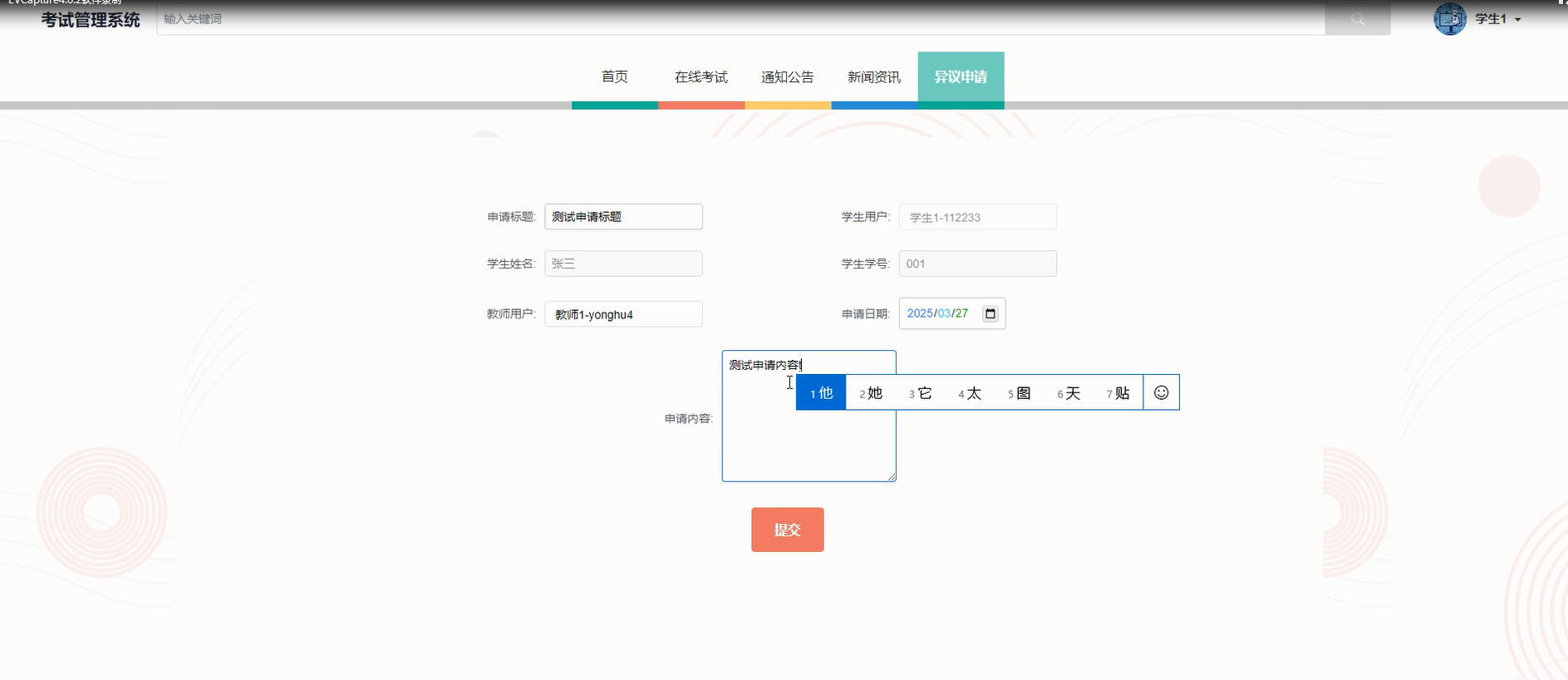 异议申请:若学生对考试成绩有疑问,可在系统中填写异议申请表单,包括标题、姓名、学号、申请日期、申请内容等字段,并提交等待教师审核处理。
