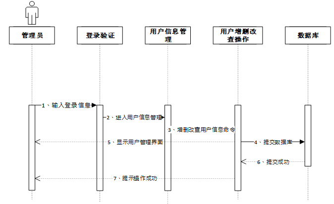 管理员输入登录信息后,进入用户信息管理模块,选择增删改查操作并提交命令至数据库。数据库执行操作后返回成功状态,系统显示用户管理界面并提示操作成功。管理员修改用户信息时序图如图4-5所示。