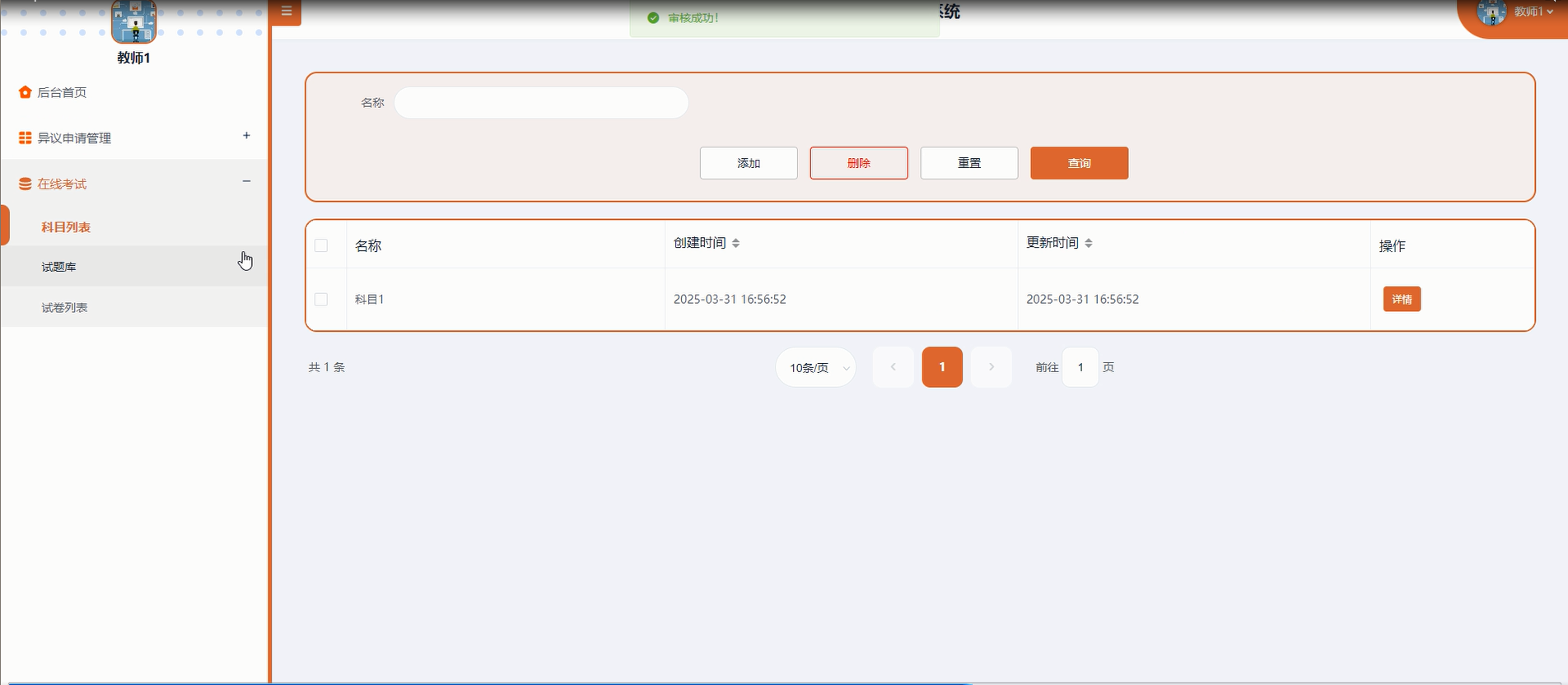 科目列表:教师能够对考试科目进行查询、重置、删除和添加操作,方便灵活地调整考试内容。每个科目记录包含科目名称、创建时间、状态(启用/停用)等基本信息。