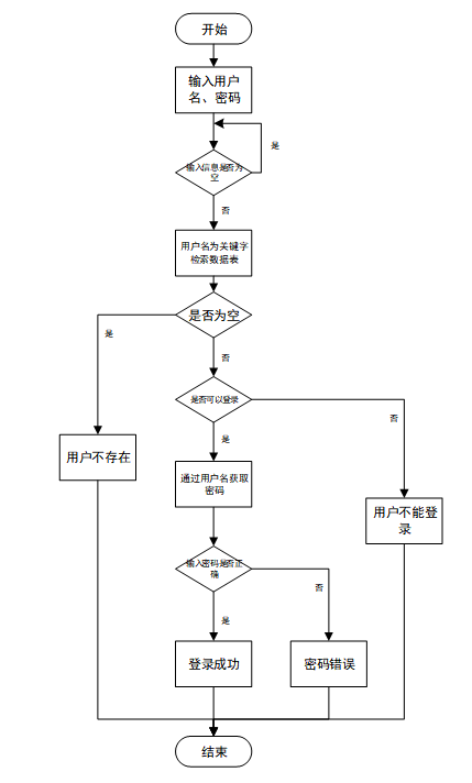 用户输入用户名和密码后,系统先检查输入是否为空,再验证用户名是否存在,若存在则通过用户名获取密码并校验。若密码正确则登录成功,否则提示密码错误。若用户名不存在或无法登录,提示用户操作无效。如图3-5所示。