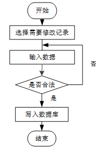 用户首先选择需要修改的记录,输入修改后的数据,系统判断输入数据是否合法。若数据不合法,提示重新输入;若数据合法,则将修改后的数据写入数据库,完成操作后流程结束。修改信息流程图如图3-8所示。