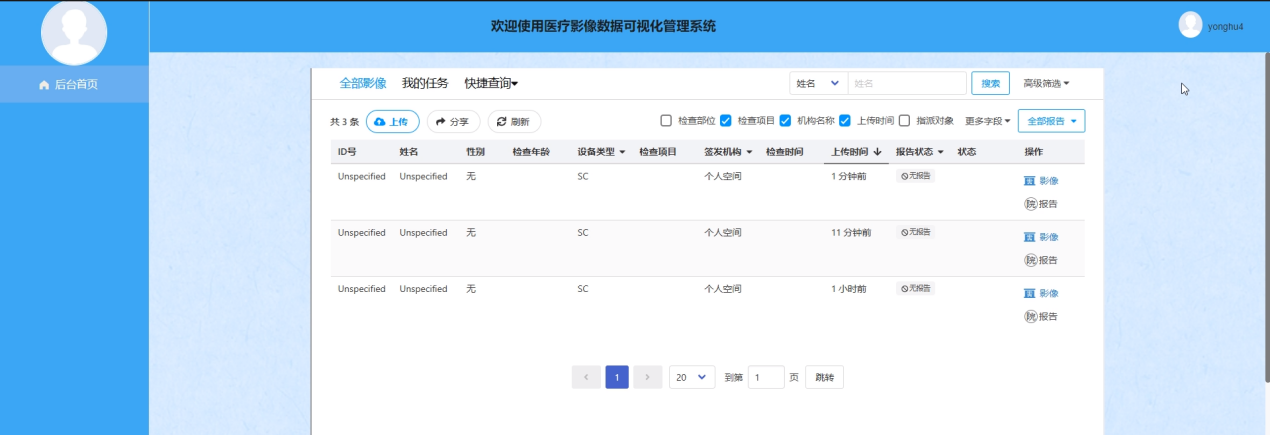 - 后台首页:医生注册登录后,可以查看用户影像信息并进行相关操作。例如,点击某个用户后面的“影像”可以查看该用户的上传的影像信息。