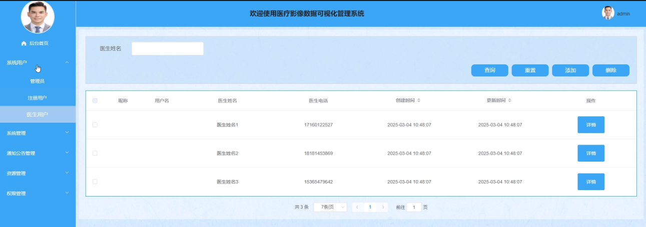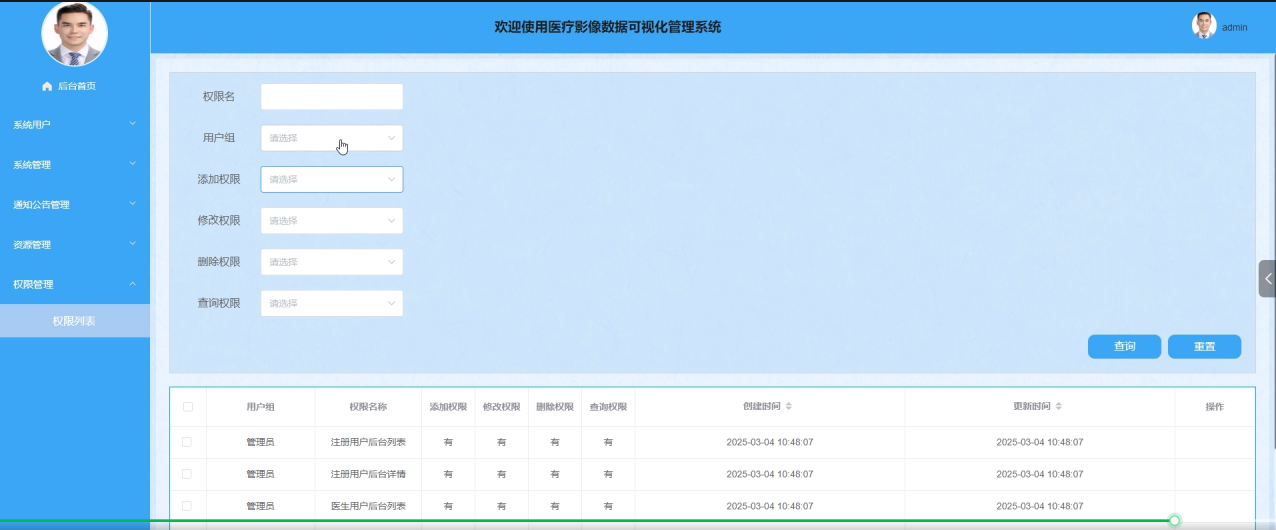 第五章:系统实现,主要介绍了医疗影像数据可视化管理系统各个用户的功能、系统界面的实现。