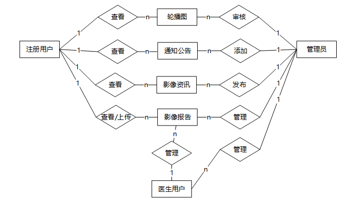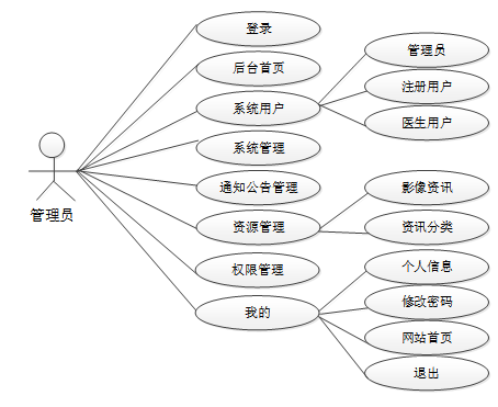 本系统分为注册用户功能、医生用户功能和管理员功能三大模块。对于普通注册用户而言,他们可以访问首页获取最新的影像资讯,并查看通知公告。用户还能上传和查询个人的影像报告,以及在影像资讯页面进行点赞、收藏、发表评论等操作。医生用户则可以通过后台首页查看并管理用户的影像信息。管理员拥有最高权限,能够管理所有用户信息、轮播图、通知公告、影像资讯及其分类,并设置不同用户角色的访问权限,确保系统的安全性和灵活性。
