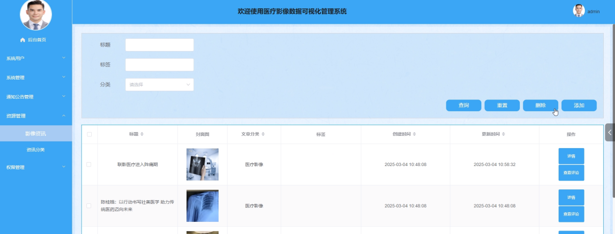 在该模块管理员可以对影像资讯和资讯分类信息进行增删改查操作。例如,点击“影像资讯”进入页面后,管理员可以查看列表中某个资讯的详情和评论,点击某个或多个资讯信息后点击“删除”并确定删除即可删除资讯信息。以影像资讯为例,其界面如图5-14所示。