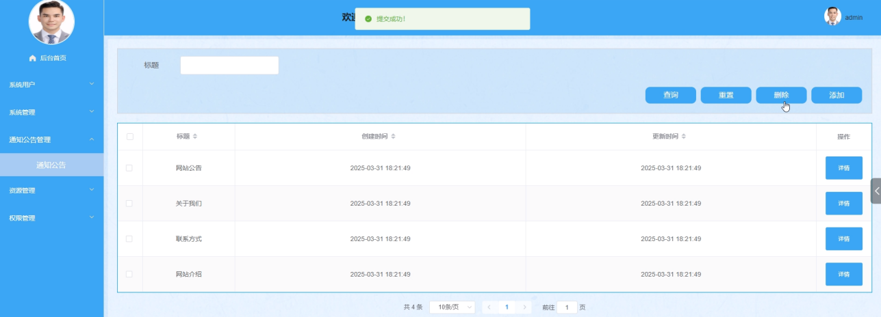 通知公告删除成功,前端不在展示该通知公告信息 |