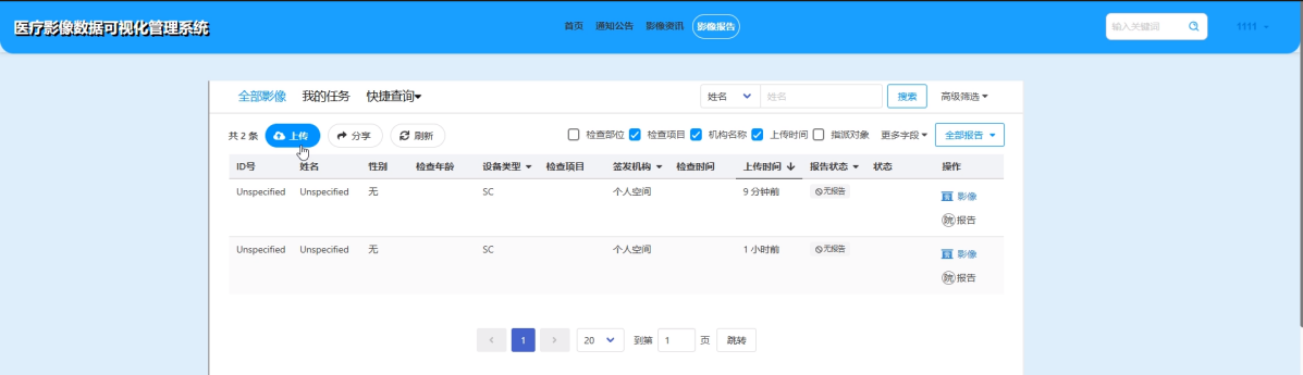 - 影像报告:在该界面用户可以进行上传影像报告、查询影像报告等操作。点击“上传”进入页面添加影像文件后点击“下一步”,填写姓名、年龄、身份证号码、临床诊断等信息后点击“下一步”,点击“开始上传”,上传成功后点击“前往检查列表”即可返回影像报告界面。