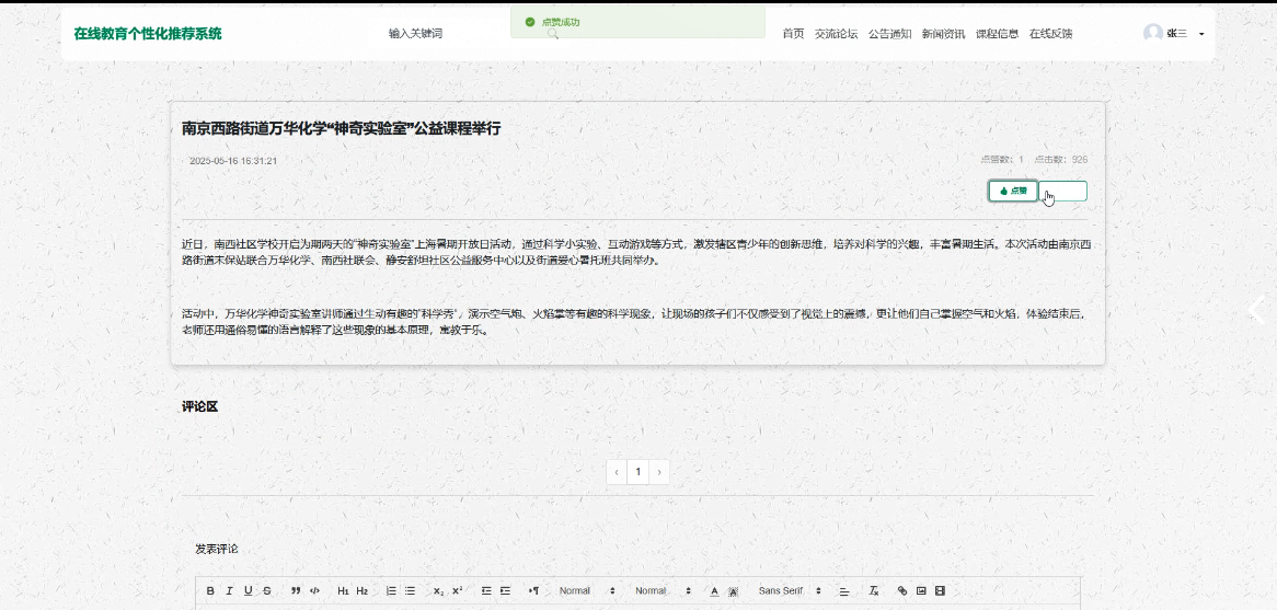 在功能实现方面,对用户兴趣偏好、学习行为等多维度数据进行分析,从而实现精准推荐和学习路径规划。同时,系统具备完善的数据管理和后台控制功能,管理员可通过后台对用户、课程、权限、资讯等内容进行高效维护与监控,保障平台的稳定运行与内容质量。
