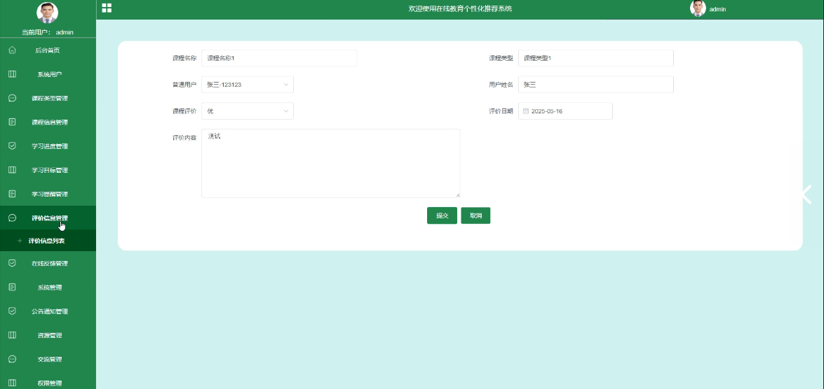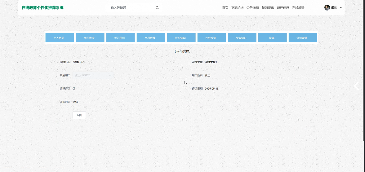 用户可以查看自己对课程的评价记录,并支持修改或补充反馈内容。评价信息界面如图5-5所示。