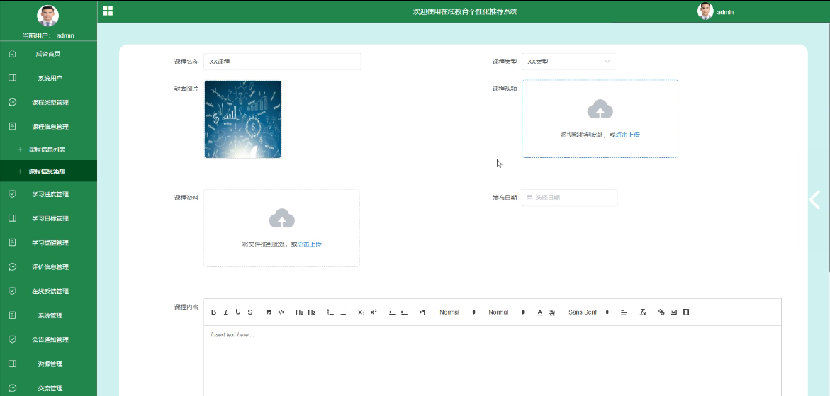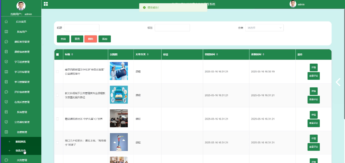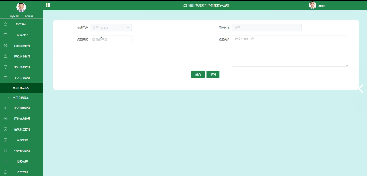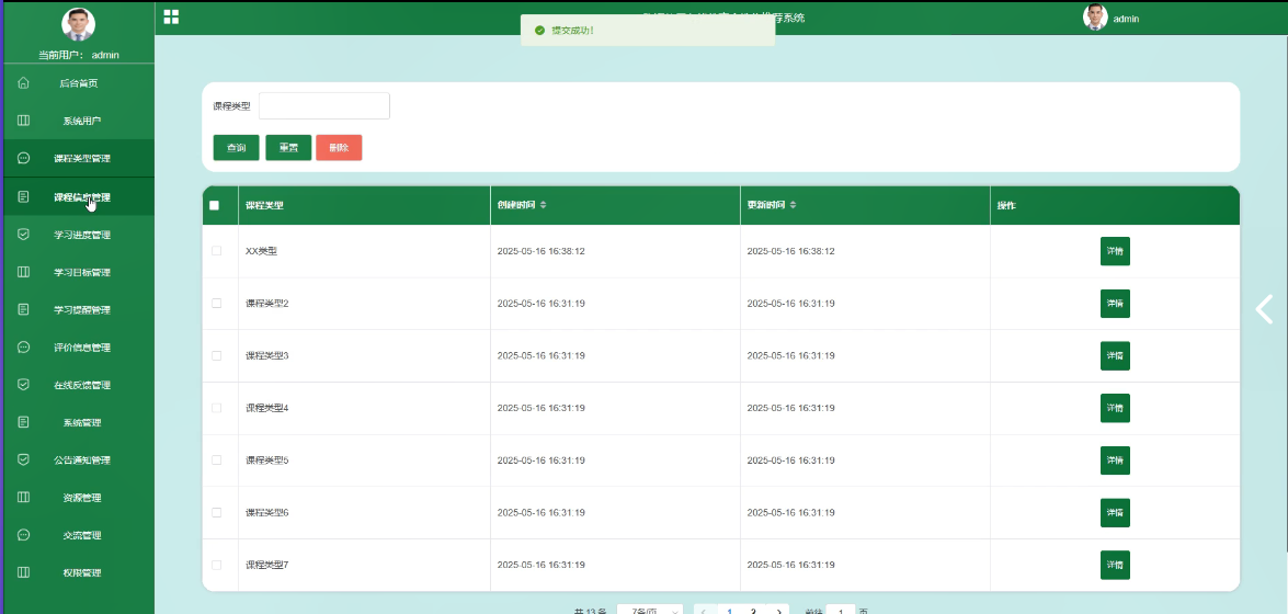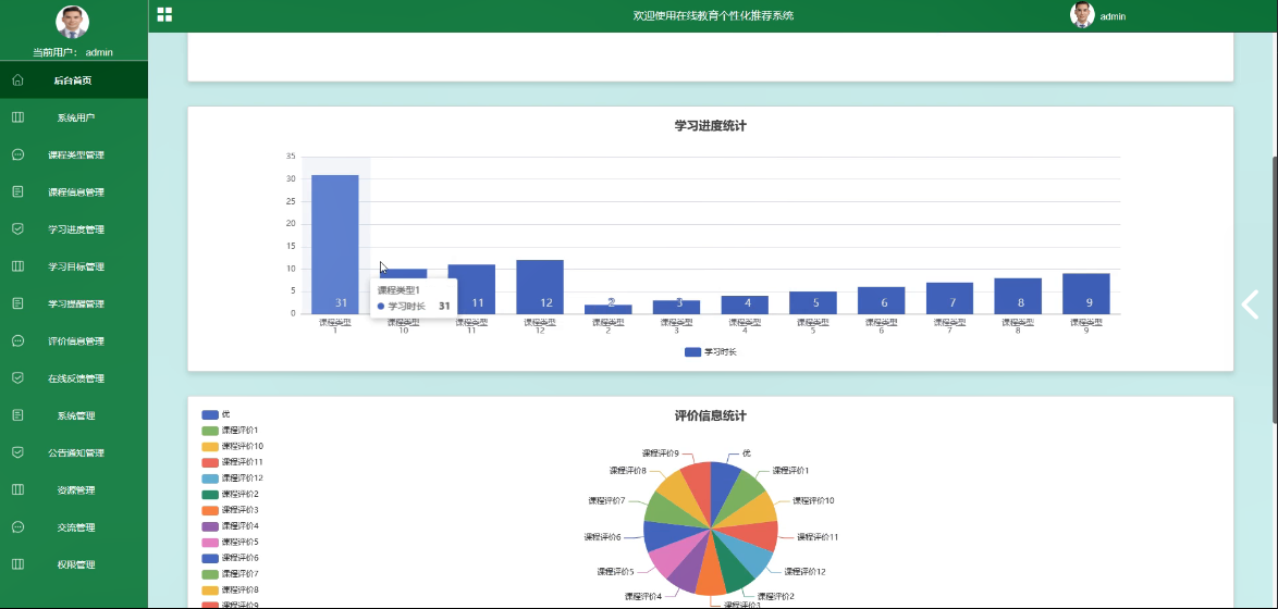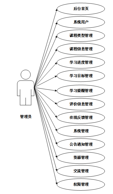 管理员可管理后台首页、系统用户、课程类型、课程信息、学习进度、学习目标、学习提醒、评价信息、在线反馈、系统管理、公告通知、资源管、交流管理、权限管理。
