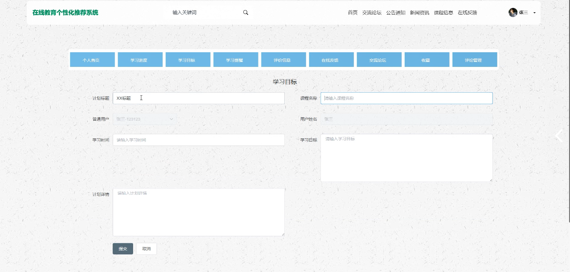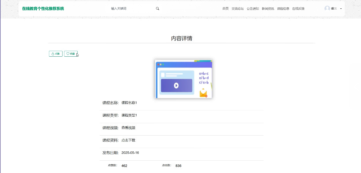 随着在线教育的快速发展,个性化推荐系统在提升学习效率和用户体验方面发挥着越来越重要的作用。本文设计并实现了一个基于Spring Boot与Vue的在线教育个性化推荐系统,采用Java语言开发,以MySQL作为系统数据库。该系统通过整合机器学习、数据挖掘及人工智能技术,根据用户的兴趣偏好、学习习惯和进度等多维度数据,为用户智能推荐适合的学习内容,并构建个性化的学习路径。系统分为用户与管理员两大角色,分别满足不同的功能需求。用户端涵盖个性化推荐、学习进度追踪、互动反馈、搜索筛选、通知提醒及个性化设置等功能;管理端则包括用户与权限管理、课程管理、推荐系统优化、数据分析与平台监控等模块。实验结果表明,系统能够有效提高学习资源的匹配度与用户满意度,具有良好的可扩展性与实用性,为未来智能教育的发展提供了有力支撑。