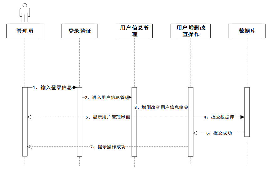 管理员输入登录信息后,进入用户信息管理模块,选择增删改查操作并提交命令至数据库。数据库执行操作后返回成功状态,系统显示用户管理界面并提示操作成功。管理员修改用户信息时序图如图4-5所示。