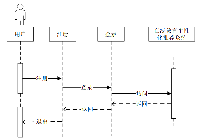 用户通过注册模块发送注册请求,系统完成注册后返回确认信息。随后,用户通过登录模块发送登录请求,系统验证用户信息后允许访问目标系统。用户完成操作后可选择退出,系统终止会话。注册时序图,如图4-3所示。