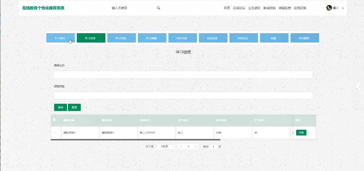 通过本系统的开发与测试,验证了Spring Boot与Vue技术在在线教育平台中的良好适配性,也体现了个性化推荐技术在提升教育资源利用率和用户满意度方面的显著作用。尽管系统在推荐算法优化、数据安全与用户体验等方面仍有一定的提升空间,但其整体架构合理、扩展性强,为后续智能教育平台的发展提供了良好的参考模型和技术基础。本研究不仅完成了一个功能完善、性能稳定的在线教育个性化推荐系统的设计与实现,也为未来将人工智能更深入地应用于教育领域提供了实践支持和思路启发。