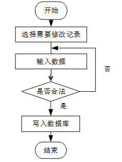 用户首先选择需要修改的记录,输入修改后的数据,系统判断输入数据是否合法。若数据不合法,提示重新输入;若数据合法,则将修改后的数据写入数据库,完成操作后流程结束。修改信息流程图如图3-7所示。