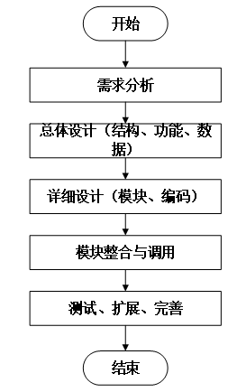 系统开发流程的主要步骤,从需求分析到系统完成的全过程。流程包括需求分析、总体设计(结构、功能、数据)、详细设计(模块、编码)、模块整合与调用,以及测试、扩展和完善,最终完成系统的开发。本系统的开发流程如图3-3所示