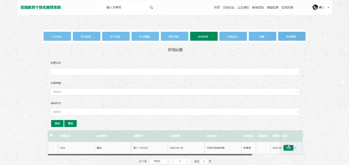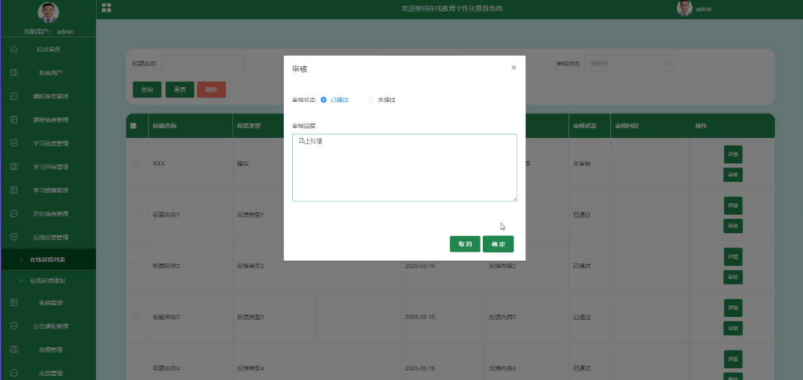 处理用户提交的意见和建议,及时响应问题,持续优化平台功能与服务体验。在线反馈管理界面如图5-12所示。