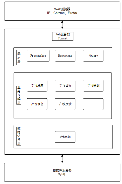 系统由表现层、业务逻辑层、数据访问层和数据库服务器组成。表现层通过浏览器(如IE、Chrome、Firefox)与用户交互,采用FreeMarker、Bootstrap、jQuery等技术实现界面呈现。业务逻辑层负责处理系统的核心业务逻辑,通过分模块设计实现功能分离。数据访问层使用MyBatis框架连接数据库,执行数据的增删改查操作。数据库服务器采用MySQL进行数据存储和管理,为系统提供稳定的数据库支持。整个架构通过Tomcat服务器完成用户请求的接收和处理,确保系统的高效运行[8]。整个系统架构如图4-1所示。