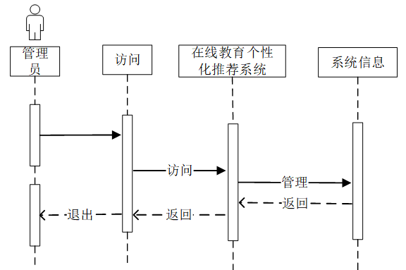 管理员通过访问系统发起请求,系统接收访问后转向系统信息模块进行管理操作。管理完成后,系统返回管理结果至系统,最终反馈给管理员,管理员可选择退出。管理员管理系统信息时序图如图4-6所示。