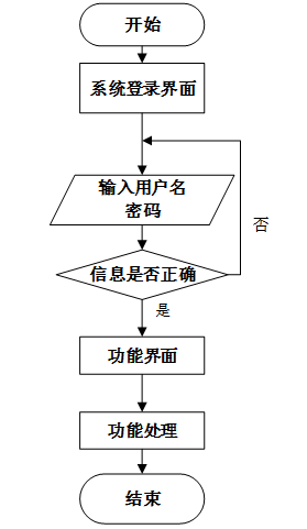 用户首先进入系统登录界面,输入用户名和密码后,系统验证信息是否正确。若验证失败,返回登录界面重新输入;若验证成功,则进入功能界面,执行相应功能处理后结束操作流程。操作流程如图3-5所示。