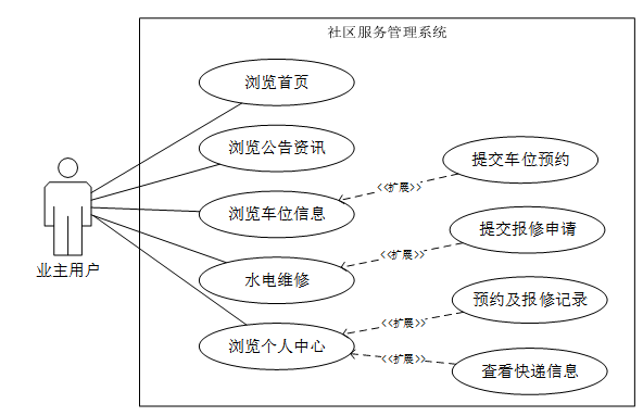 业主用户可通过系统查看首页信息、浏览社区公告与资讯,实时掌握社区动态;在线预约车位、提交水电维修申请,提升生活便利性;在个人中心中管理预约记录、报修进度、快递信息,并支持资讯收藏与评论,增强互动体验,打造高效便捷的社区服务环境。业主用户用例图如图3-1所示。