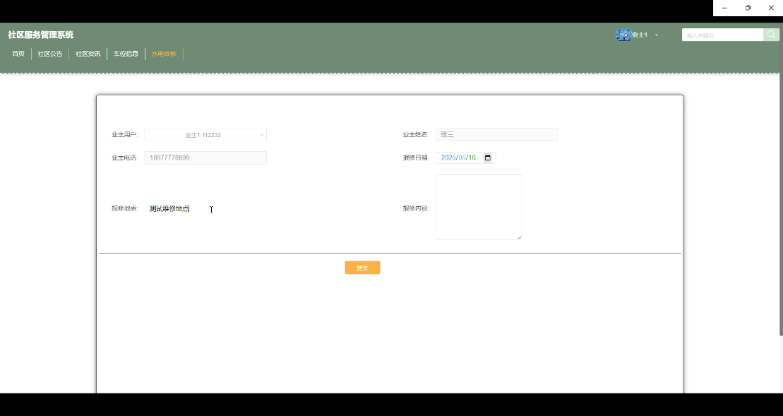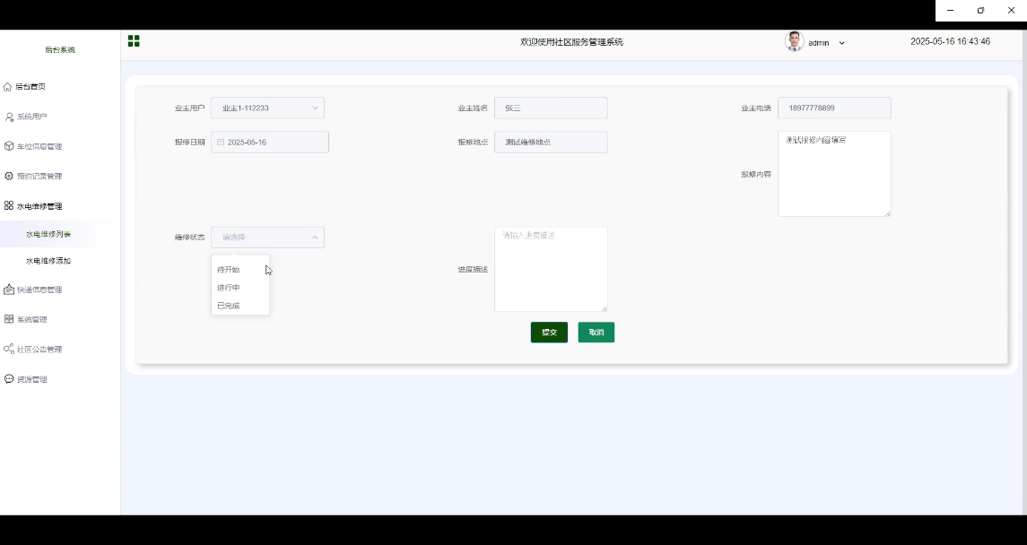 (4)水电报修功能测试旨在验证用户提交维修请求后,系统能否准确记录相关信息,并及时通知相关部门处理。此外,还需检验管理员能否有效地更新维修状态和进度。测试将涉及填写详细的报修内容、选择正确的报修地点等操作。