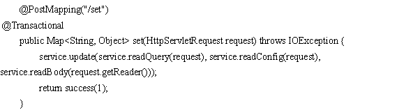 修改一个数据,原理与add基本一致,不同点在于通过readConfig()读取关键字,以及通过readQuery()获取URL后面?指定位置的标识,转成Map对象后,执行update操作,同样通过拼接的sql语句执行,执行过程读取query,toWhereSql()语句完成数据库操作,body为修改对象的值,代码如下: