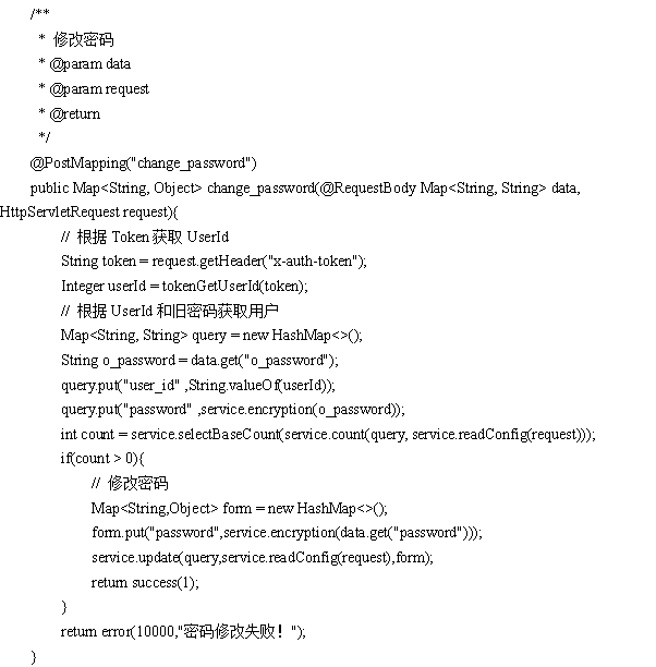修改密码,通过请求data,获取旧密码,并将新密码重新赋值,期间都是需要通过加密,代码如下 :