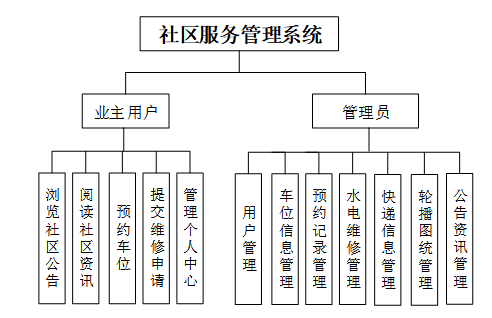 本文围绕业主用户与管理员两大角色展开功能设计,涵盖了首页信息展示、社区公告与资讯浏览、车位预约、水电报修、快递信息查询等便民服务,以及用户管理、车位与预约审核、维修处理、内容发布等管理功能。通过模块化设计实现信息高效流转,提升社区服务响应速度与管理水平,满足居民日常需求与物业运营管理要求,构建一个智能化、可视化、互动性强的社区服务平台。