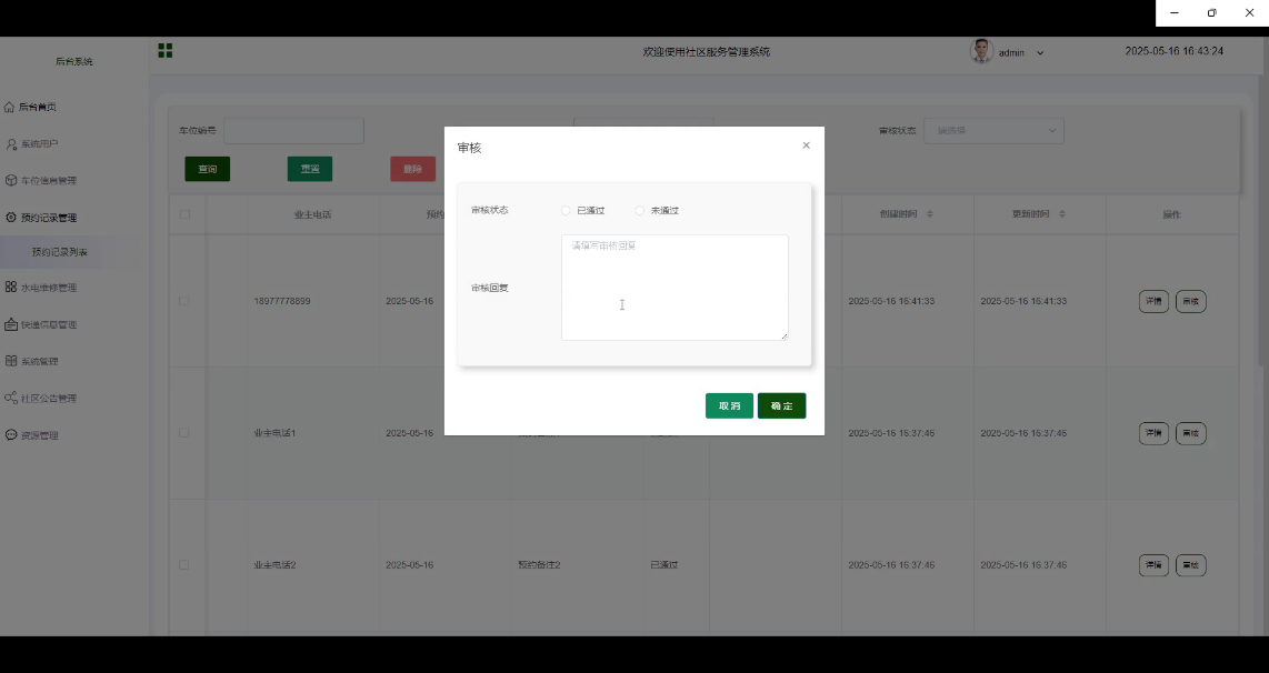 预约记录管理功能主要用于管理员审核业主提交的车位预约申请。管理员可以查看每条预约记录的详细信息,包括预约人姓名、联系方式、预约车位编号及日期等,并依据实际情况批准或拒绝预约请求。界面图如图5-10所示。