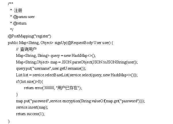 注册页UserController.java,传入user对象,并将"user_id"、 "state"、 "user_group"、"login_time"、"phone"、"phone_state"、 "username"、"nickname"、"password"、"email"、"email_state"、"avatar"、"create_time"输入,重点是 "username"、"nickname"、"password"必须输入,通过获取username,数据库查询是否有该用户,如果存在,则提示“用户已存在”,否则执行将UserId置为空(数据库表中该字段已设置自动递增),代码如下: