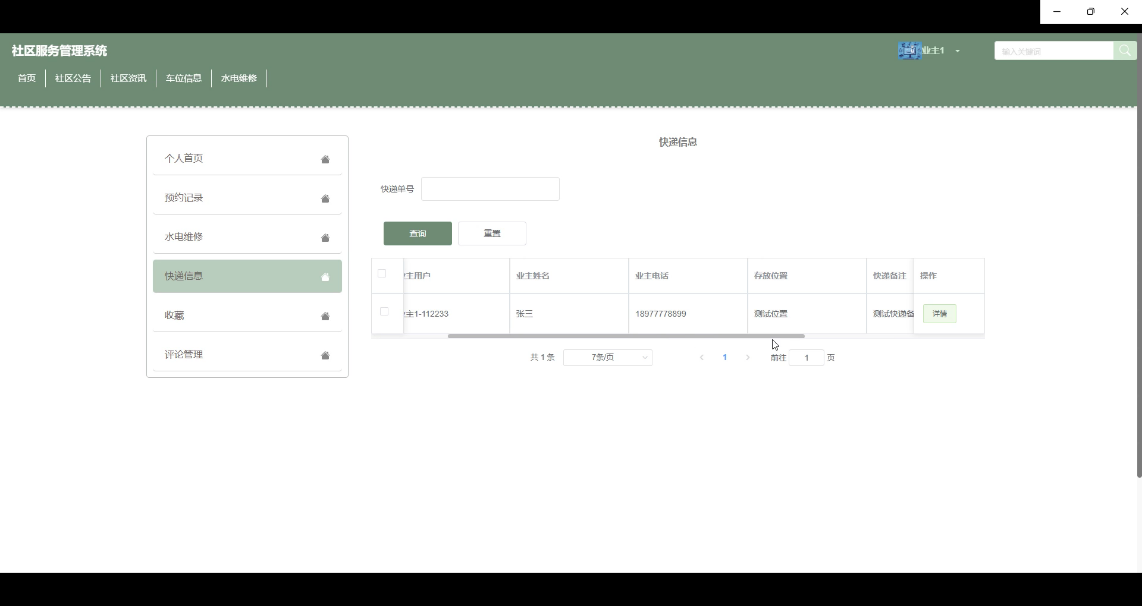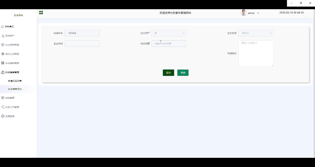 快递信息管理功能让管理员能够便捷地添加和管理社区内的快递相关信息。管理员可录入快递单号、对应的业主用户ID、业主姓名、联系电话、包裹存放位置以及必要的备注说明等。界面图如图5-12所示。
