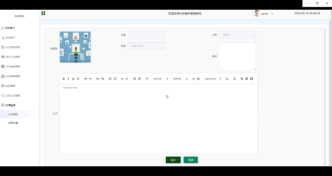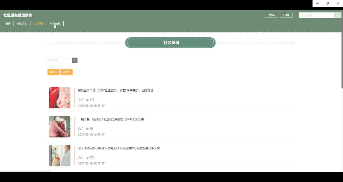 社区资讯管理功能允许管理员收集、审核并发布有益于社区居民生活的各类资讯。管理员可以从多种来源获取资讯内容,经过筛选和整理后发布到平台上。这些资讯涵盖健康养生、文化娱乐、周边商家优惠等多个方面,旨在丰富居民的生活知识,增进邻里关系。界面图如图5-13所示。