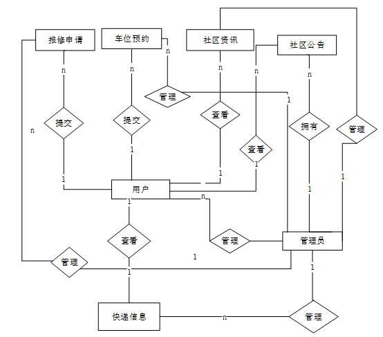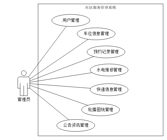 管理员可查看后台首页数据概览,全面掌握社区服务运行情况;对业主和管理员账户进行统一管理;维护车位信息并审核预约申请;处理水电维修请求,录入与更新快递信息;同时负责轮播图、社区公告与资讯的内容发布与管理,保障平台有序高效运行。管理员用例图如图3-2所示。