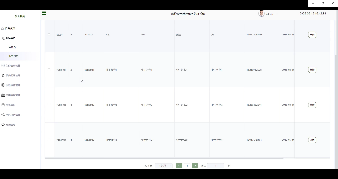 The system functions include homepage browsing, community announcement viewing, parking reservation, water and electricity repair, express information query, and personal center management for property owners and users. At the same time, it provides backend functions such as user management, parking space review, maintenance processing, and information release for administrators. By implementing a front-end and back-end separation architecture, development efficiency and system maintainability can be improved. The application of the system helps optimize community service processes, improve property management efficiency, enhance resident satisfaction, and promote the development of digital and intelligent community governance.