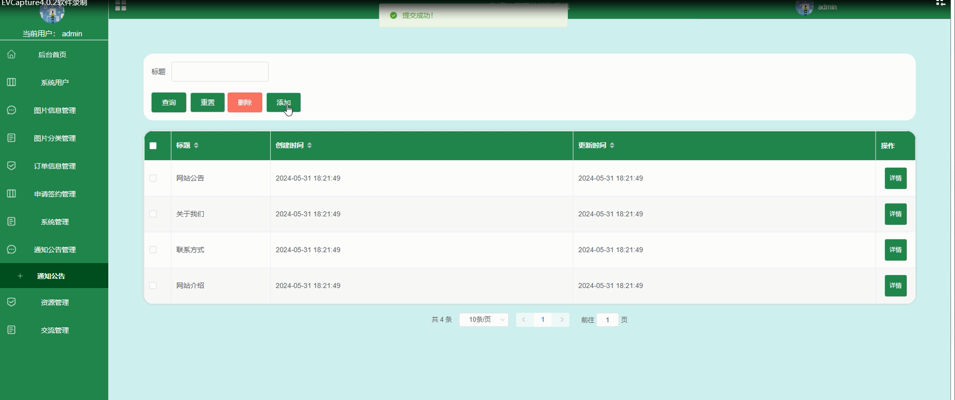下表是图片信息管理功能的测试用例,检测了对图片信息的增加,删除,修改,查询操作是否成功运行。观察系统的响应情况,得出该功能也达到了设计目标,系统运行正确。