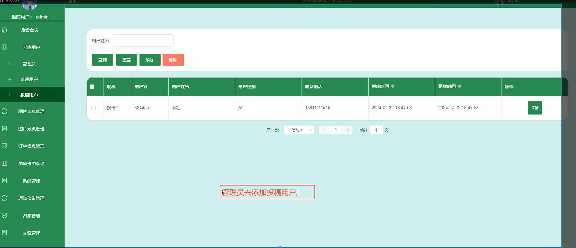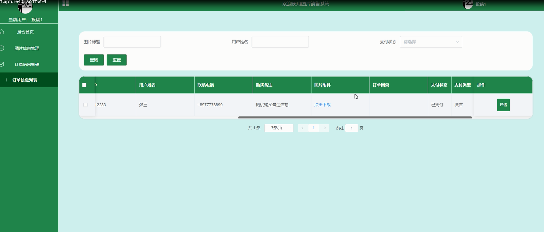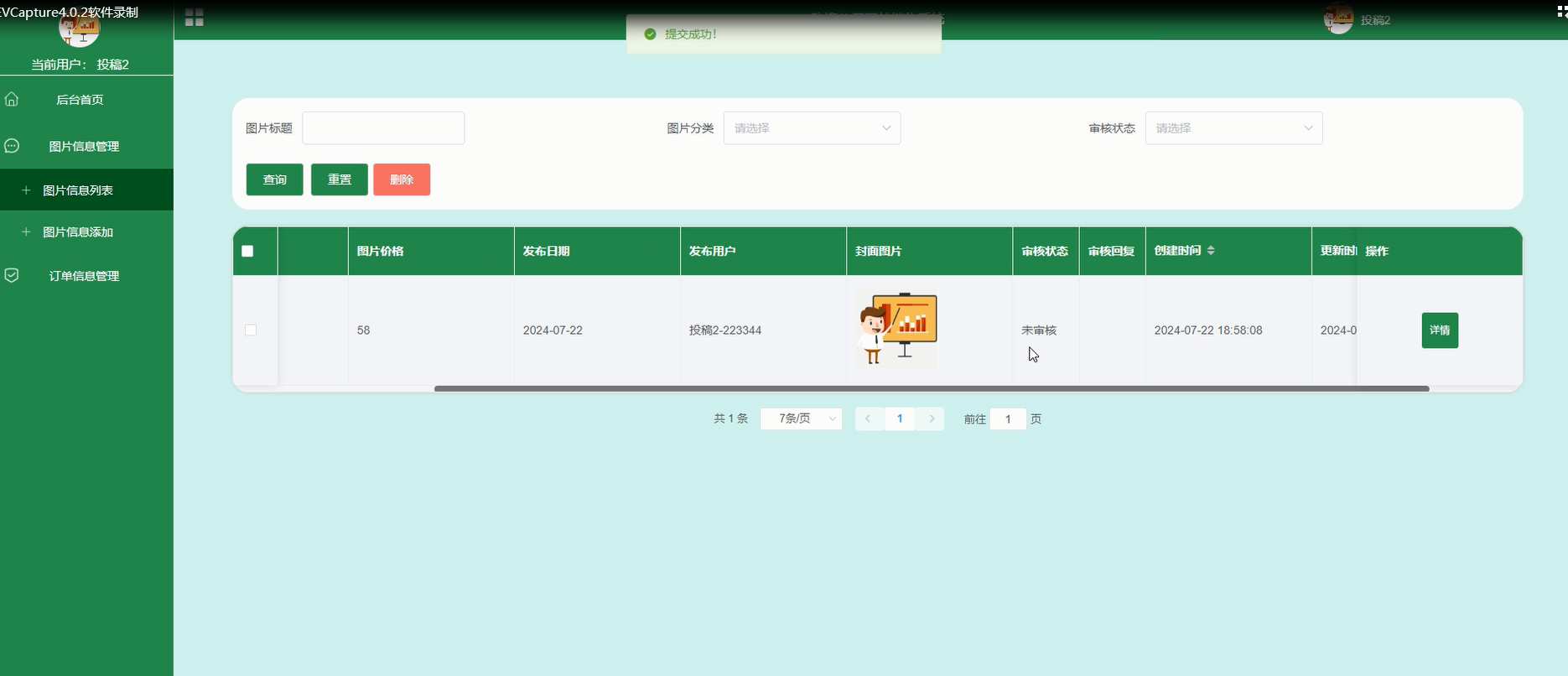 投稿用户主要包括后台首页、图片信息管理、订单信息管理等功能。