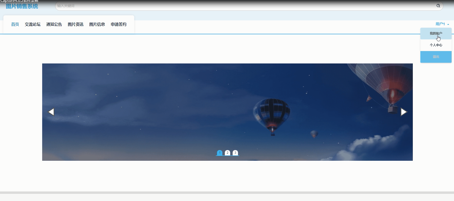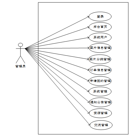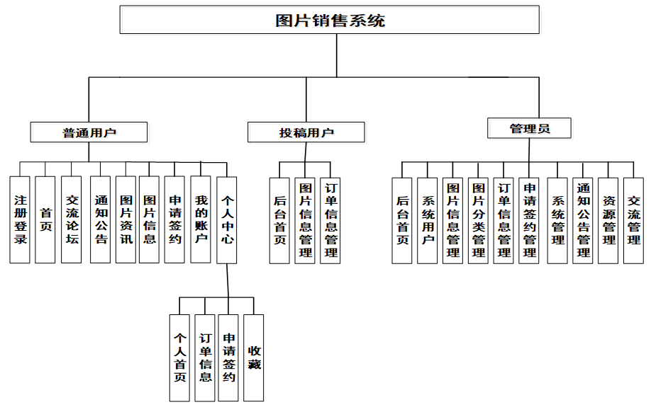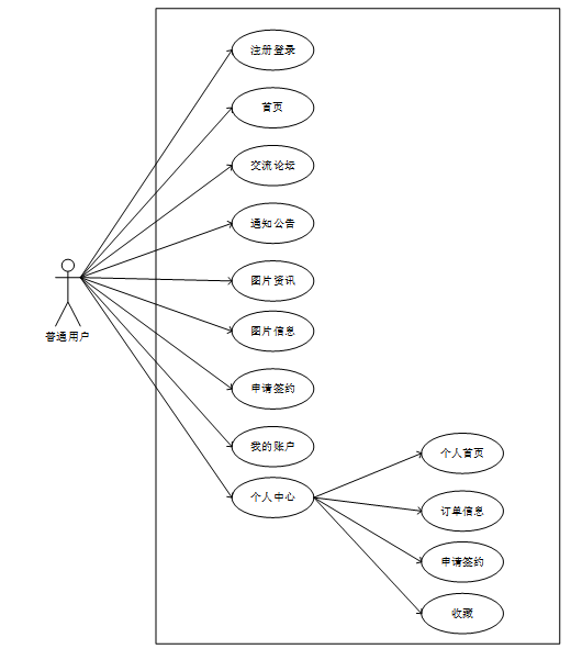 普通用户主要包括首页、交流论坛、通知公告、图片资讯、图片信息、申请签约、我的账户、个人中心(个人首页、订单信息、申请签约、收藏)等功能。