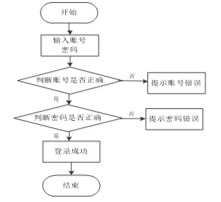 用户输入账号和密码后,系统首先判断账号是否正确,若不正确则提示“账号错误”;如果账号正确,则继续判断密码是否正确,若密码错误则提示“密码错误”;若账号和密码均正确,则显示“登录成功”,最后结束流程。如图3-4所示。