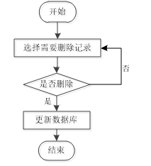用户首先选择需要删除的记录,然后系统判断是否执行删除操作。如果用户选择不删除,则返回重新选择;如果选择删除,则更新数据库完成记录删除操作,最后结束流程。如图3-6所示。