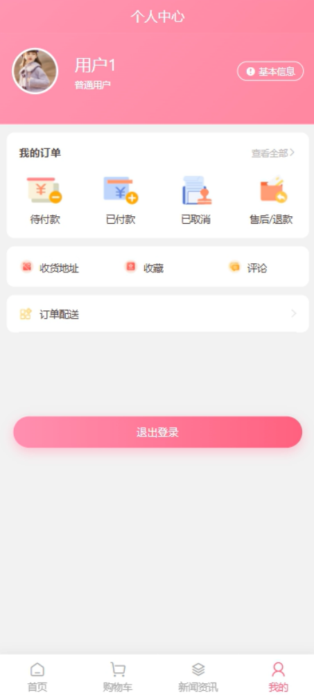 我的(我的订单、收货地址、收藏、评论、订单配送):在个人中心,用户可以查看自己的订单记录、管理收货地址、查看收藏商品、发布商品评论,并跟踪订单配送状态,提供完整的售后与服务体验。