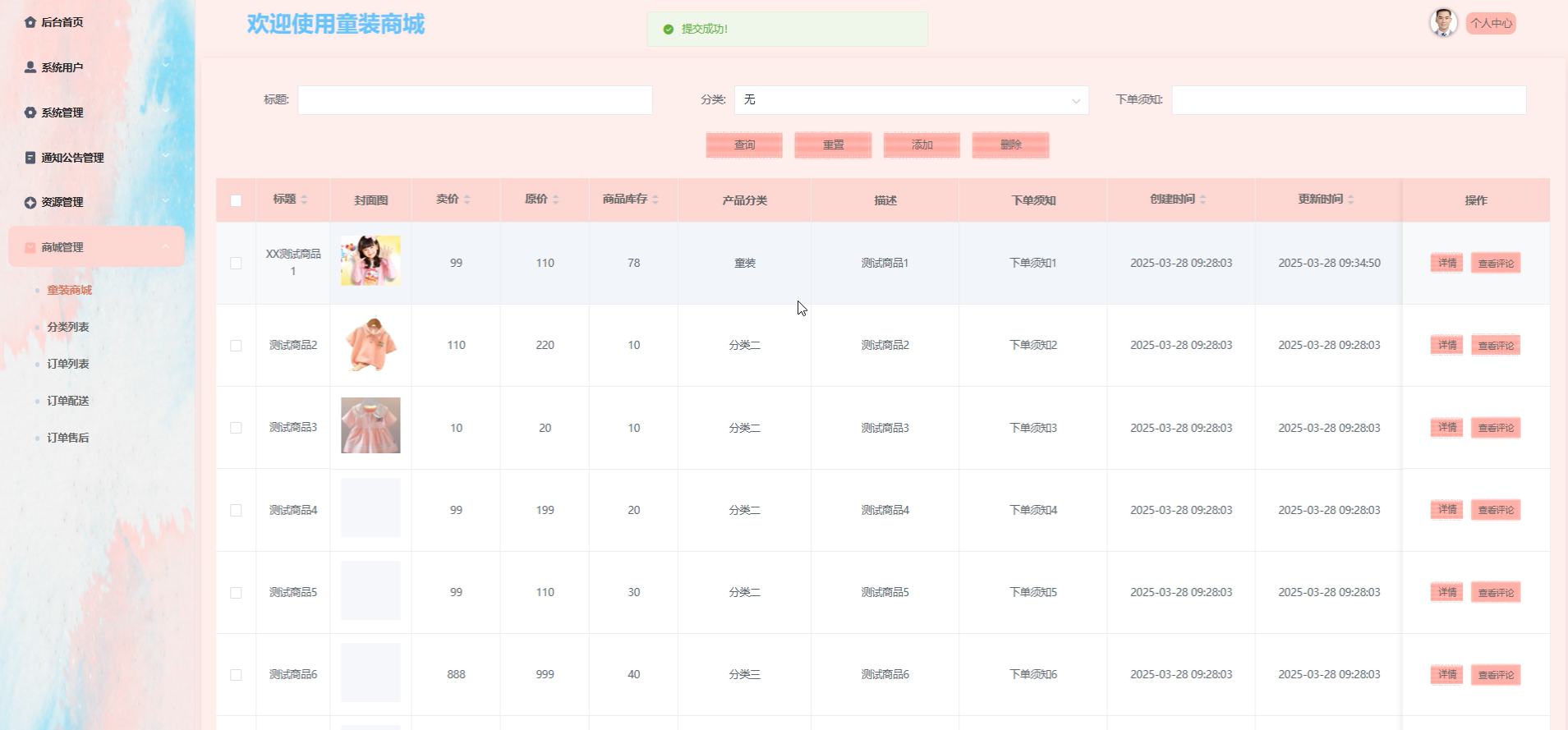 商城管理(童装商城、分类列表):管理员可以进行商品管理,包括添加、编辑或删除童装商品,并对商品进行分类管理,确保商城商品的丰富性与条理性。