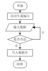 系统开始后自动生成编号,用户输入数据。系统判断输入的数据是否合法,若不合法则返回重新输入;若合法,则将数据写入数据库,最后结束流程。如图3-5所示。
