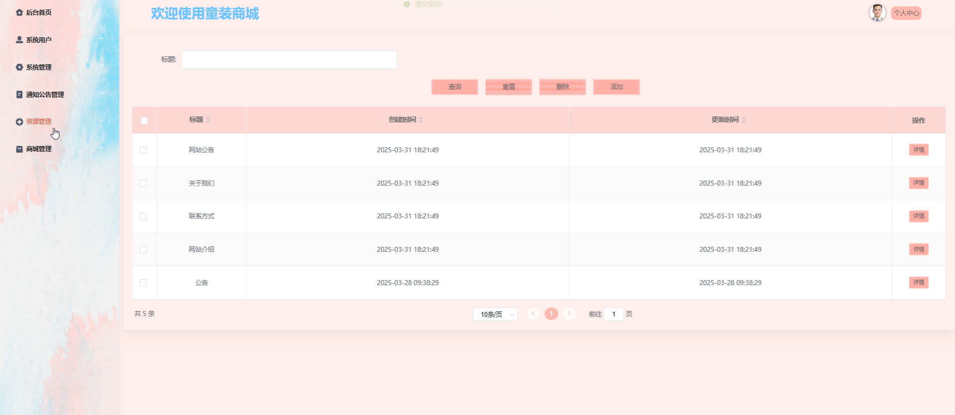 管理员可以管理平台上的新闻资讯内容及其分类,更新与童装行业相关的新闻、文章或产品推荐,增强商城的内容丰富性,吸引更多用户访问。资源管理界面如图5-9所示。